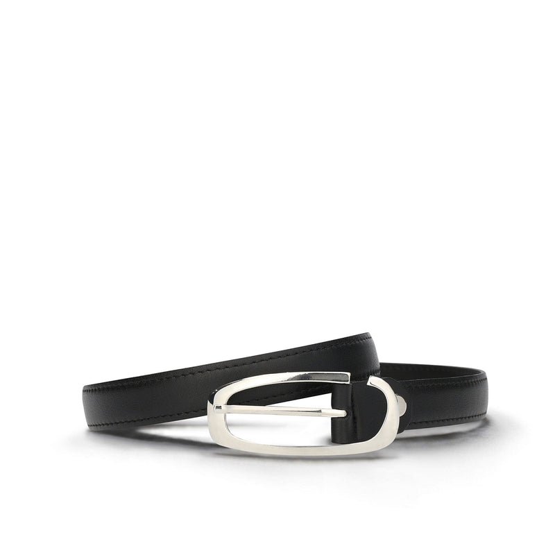 Introducing Carme Black: the epitome of modern elegance for women. Crafted from sustainable vegan leather, this belt exudes sophistication and durability. Its discreet, solid print in rich, tanned shades and exposed sewn edges ensure lasting style. The elongated nickel-free metal buckle, featuring a distinctive rupture cut, adds a unique touch. Versatile and chic, it effortlessly complements dresses or jeans, ideal for office chic or a casual flair. Elevate any ensemble with this cruelty-free, semi-formal essential.