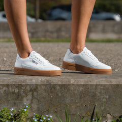 The crisp upper keeps the look minimal and versatile, while the brown sole brings vintage character and earthy balance.