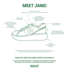 Das Design der JANE Sneakers ist durchdacht, langlebig und nachhaltig, ohne Kompromisse bei Stil oder Komfort einzugehen. Ob für Spaziergänge in der Stadt oder den Alltag – JANE ist dein Statement für umweltbewusstes und stilvolles Leben.